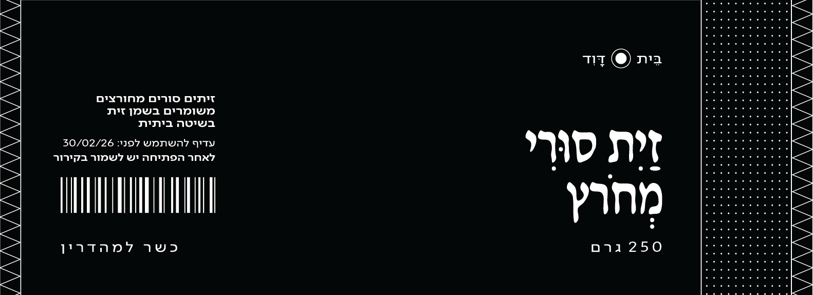 Beit David is a boutique olive oil brand originating from Israel. The brand narrative explores the manual craft of olive oil production as a path to self-discovery and reconnection with the land. Its visual identity features detailed illustrations layered with hidden meanings, complemented by decorative elements and typography inspired by ancient artifacts from the Levant region.