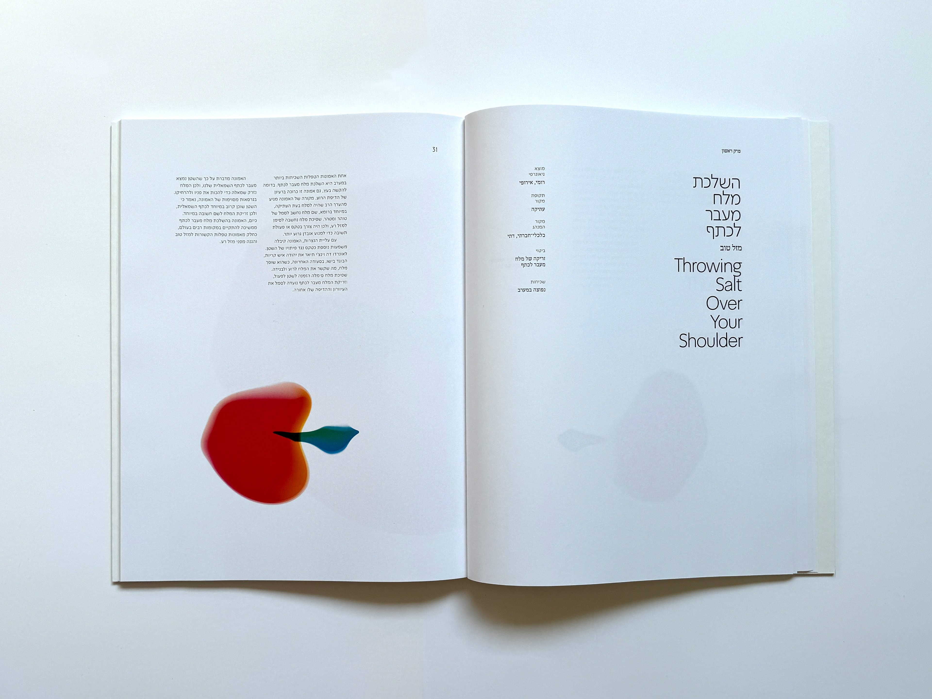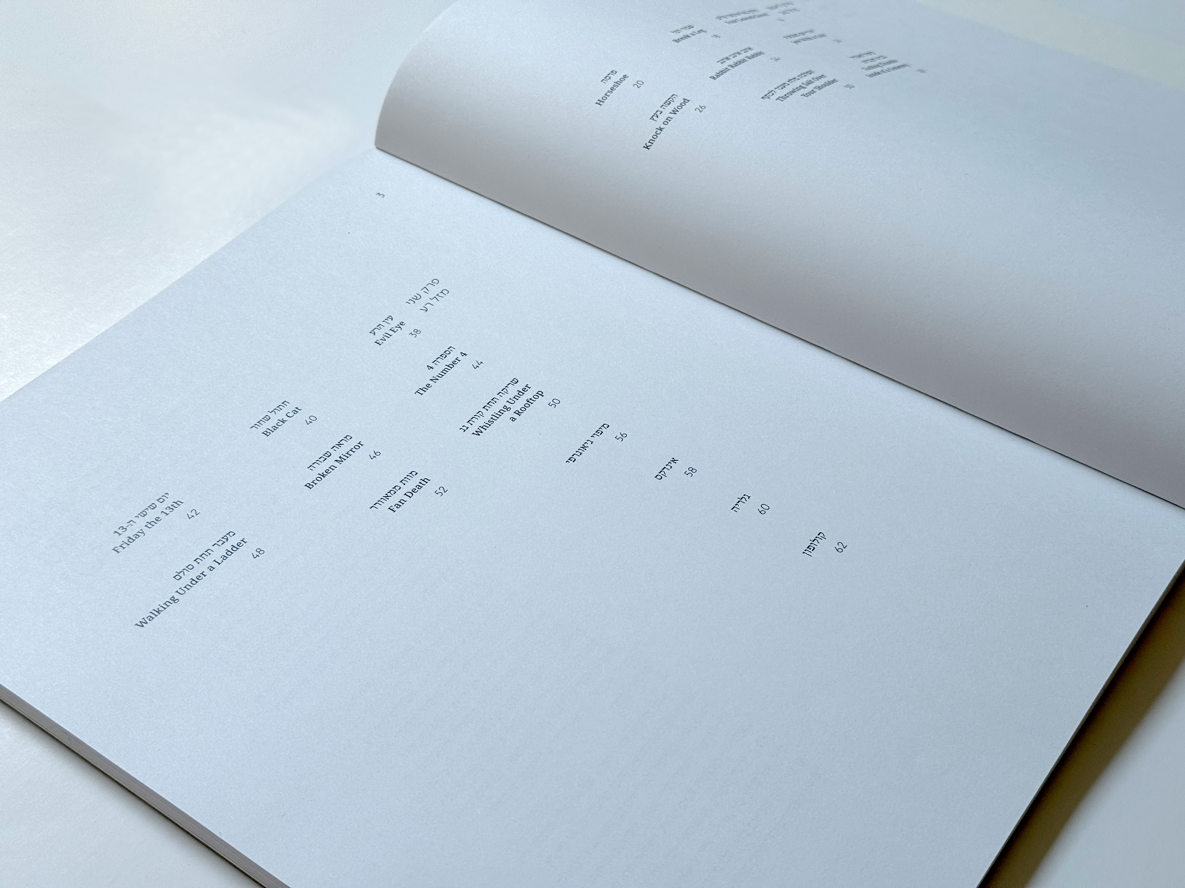Design for a catalogue of superstitions. The book consists of a table of contents, an introduction, two chapters focusing on good luck and bad luck, an index, and a gallery. Each entry includes specific criteria and a short paragraph elaborating on the belief, accompanied by an abstract visual interpretation. The visuals accompany the reading experience throughout the book, symbolizing the forces of good and evil, each dominating one of the chapters. The book’s content was collected from across the internet and summarized using AI. The imagery and layout design were created by me.